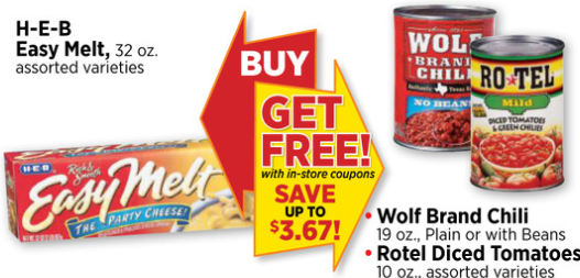 If you missed the FREE Rotel last week with purchase of H-E-B Easy Melt ($3.99), you're in luck because this week you also get Wolf Brand Chili FREE with purchase! That's $3.67 in savings and a great recipe for queso (cheese dip) that go perfect with the deal below on tortilla chips! YUM!